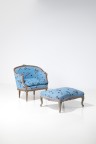 Duchesse brisée in Louis XV and XVI style Moulded, carved and lacquered wood Upholstery by Vincent Darré in a 1940s fabric H 83 × W 84 × D 68 cm (bergère) H 35 × W 73 × D 66 cm (ottoman)