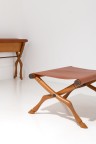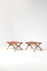 Pair of folding stools 'Diphros Okladias' model Walnut, brass and leather Saridis edition Publisher's plaque under the seats Model created in 1963 H 40 x W 63 x D 81 cm