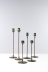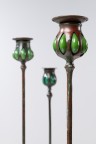 Set of three pairs of candlesticks Bronze and Favrile glass Tiffany Studios edition Engraved 'Tiffany Studios' under three of them All numbered Model created around 1910 H 33 x Ø 14.5 cm H 44.5 x Ø 15cm H 52 x Ø 15cm