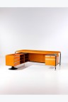 Executive desk Walnut, lacquered metal, and aluminum M.I.M edition Model created around 1960 Desk: H 73 × W 210 × D 90 cm With module: D 172 cm Module: H 63.5 × W 137 × D 45 cm