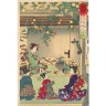 Yoshu Chikanobu (1838-1912) Triptyque oban tate-e, Kintoki à cheval sur un ours dans la montagne, Yama Uba à ses côtés, accompagnés par des singes et des lapins. Signé Yoshu Chikanobu, 1890, éditeur Sawa Kuyjiro. (Pliure médiane, quelques taches) Ogata Gekko (1859-1920) Oban tate-e, de la série Zuihitsu, Essais par Gekko, Urashima Taro repartant du royaume de Ryujin. Signé Gekko suivi d'un sceau, 1890. 34,7 × 24 cm (Couleurs passées, tache) On y joint quatre oban tate-e : geishas participant à une cérémonie du thé (partie de triptyque), geisha dans un jardin, page de titre ornée d'un bonsaï.