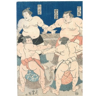 Quatre oban tate-e par Yoshikuni, Yoshisada,Kuniyoshi et Eisen : acrobates, monstre devant