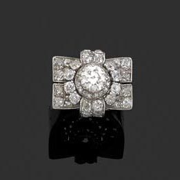 Bague "chevalière" en or gris 18 k (750°/oo) de forme géométrique, sertie de diamants ronds de taille ancienne, celui du centre plus...