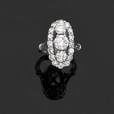 Bague en platine de forme navette sertie de diamants ronds de taille brillant, trois au centre plus importants.Travail français.Tour...