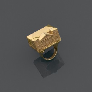 Meret OPPENHEIM (1913-1985) 1985 Bague "Cage" en or jaune 18k (750‰) et rubis