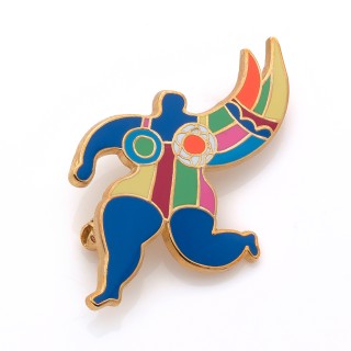 Niki de SAINT-PHALLE (1930-2002) Broche/pendentif "Nana" en métal doré et émail polychrome, cordon de soie.