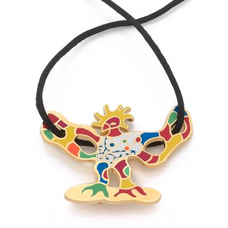 Niki de SAINT-PHALLE (1930-2002) Broche/pendentif "L'oiseau de feu" en métal doré et émail polychrome, cordon de soie.