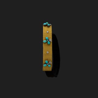 Bracelet souple en or jaune 18 k (750°/oo) tressé, décoré de trois motifs "fleurs de lys" sertis de turquoises cabochon et diamants ...
