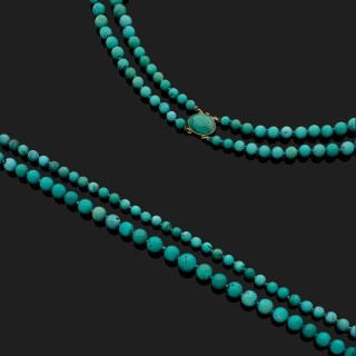 Collier deux rangs de 51 et 55 boules de turquoise matrix en chute, le fermoir en or jaune 18 k (750°/oo) serti d'une turquoise cabo...