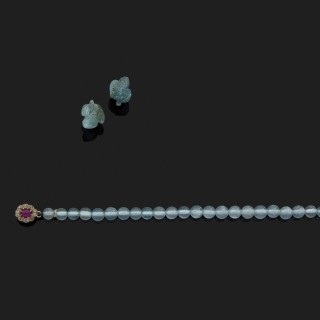 Collier en or jaune orné d'un pendentif (amovible) à trois pampilles serties d'émeraudes, demi-perles et petits diamants taillés en ...