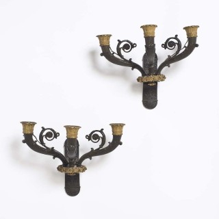 Paire d’appliques à trois bras de lumièreen bronze patiné et doré, à décor de rinceaux