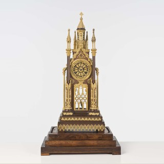 Pendule en forme de cathédrale en bronzepatiné et doré, à décor d’arcatures et pinacles ;