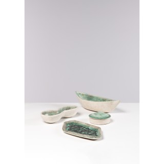 Bruno Gambone (1936-2021) Ensemble composé de quatre plats et de trois boîtes -