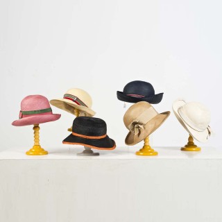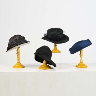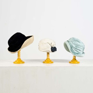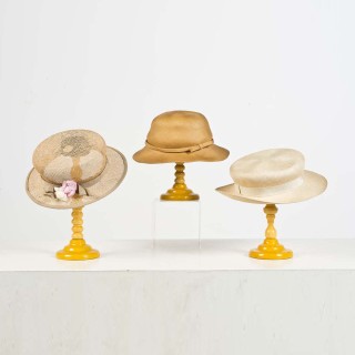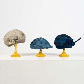 GIVENCHY : un chapeau en vison, une coiffure en velours marron et tissu jaune, un chapeau en tissu marron et une voilette