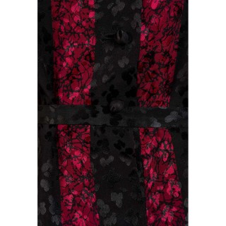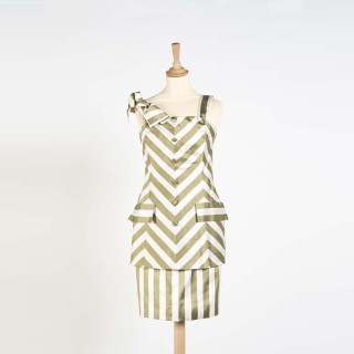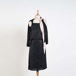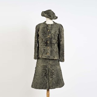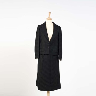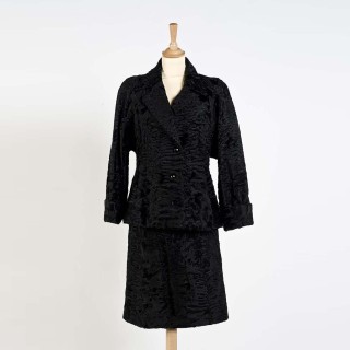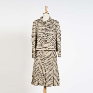 CHANEL. Ensemble jupe plissée et veste à motifs noirs sur fond r ...