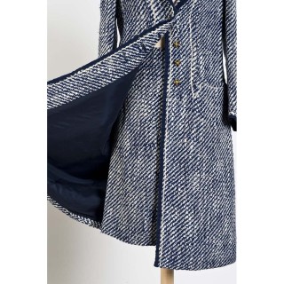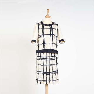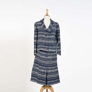 CHANEL. Tailleur jupe en lainage bleu marine et blanc.