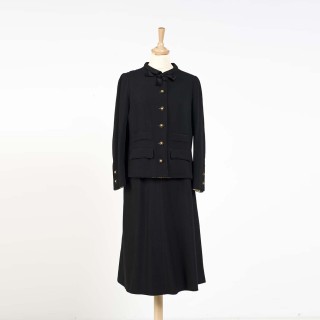 CHANEL. Tailleur jupe noir à 4 poches, veste doublée satin crème ...
