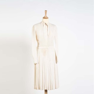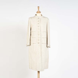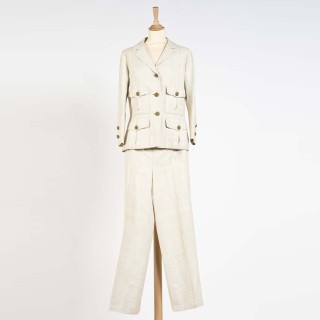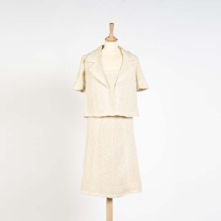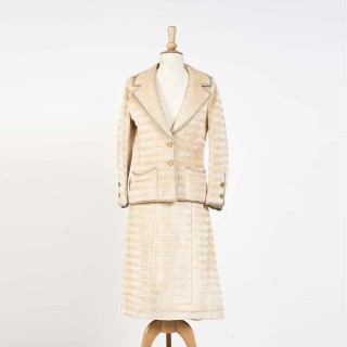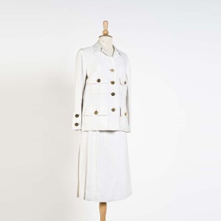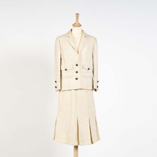 CHANEL. Tailleur jupe à plis plats en lainage crème.