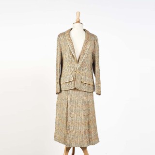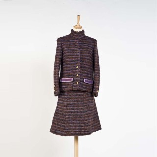 CHANEL. Tailleur jupe en lainage rayé dans les tons rouille, mau ...