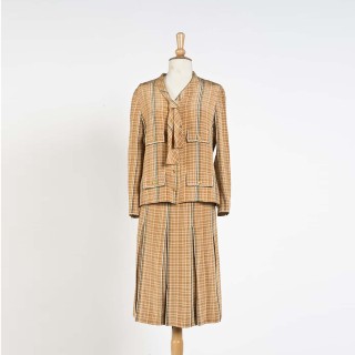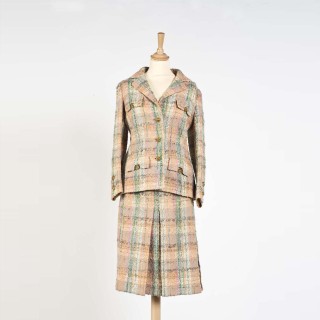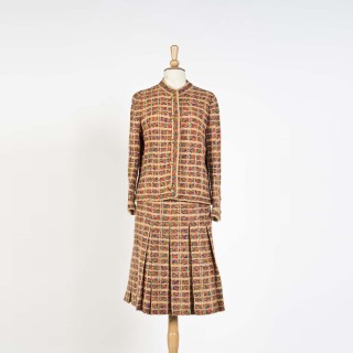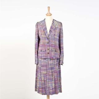 CHANEL. Tailleur jupe plissée en lainage à carreaux multicolores ...