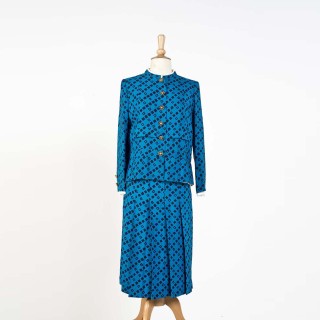CHANEL. Ensemble jupe plissée et veste en soie turquoise à motif ...