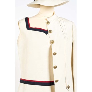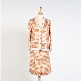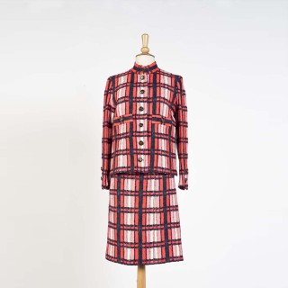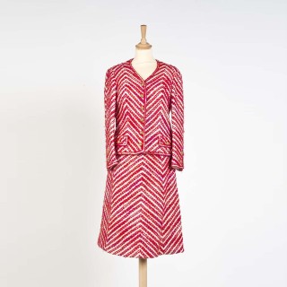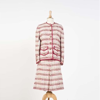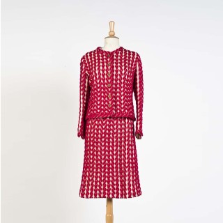 CHANEL. Tailleur jupe en lainage rouge et crème.