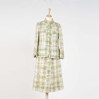 CHANEL. Tailleur jupe en lainage blanc, vert anis et marron.