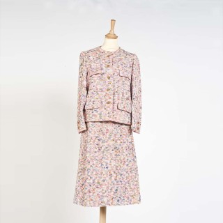 CHANEL. Tailleur jupe lainage rose chiné multicolore.