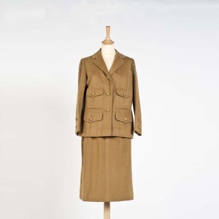 CHANEL. Tailleur jupe en lainage tabac à 4 poches.