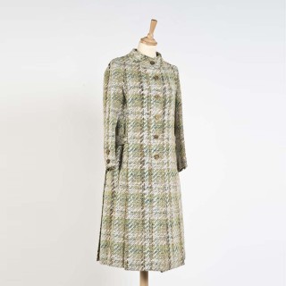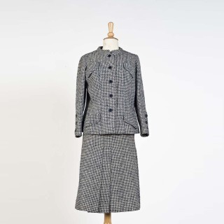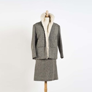 CHANEL. Tailleur en lainage pied de poule, jupe à gros plis.