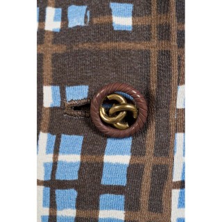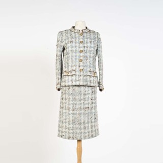 CHANEL. Tailleur jupe en lainage gris-bleu, blanc & marron ( ...