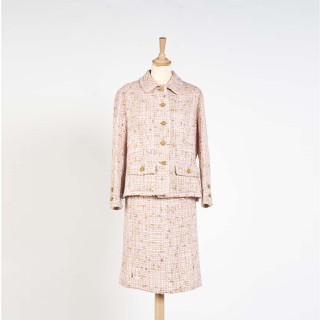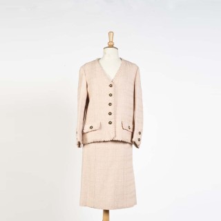 CHANEL. Tailleur jupe en lainage rose poudré.