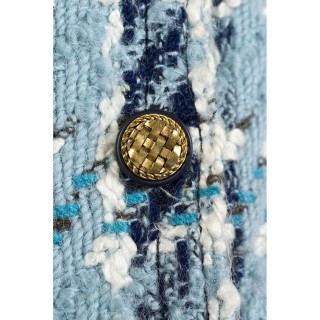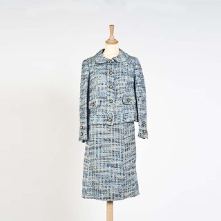CHANEL. Tailleur jupe en lainage en dégradé de bleu sur fond bla ...