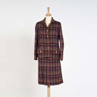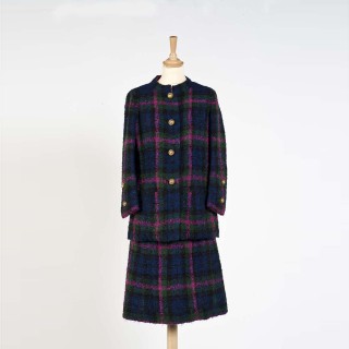 CHANEL. Tailleur jupe en lainage écossais bleu marine, vert et r ...