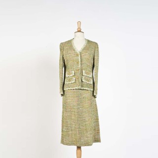 CHANEL. Tailleur jupe en lainage vert-anis et beige. On y joi ...