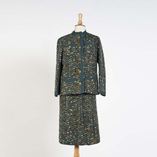 CHANEL. Tailleur jupe en lainage vert et rose.
