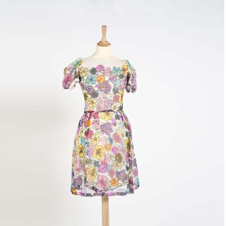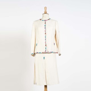 CHANEL. Ensemble corsage, jupe et veste d'été à décor de fleurs ...