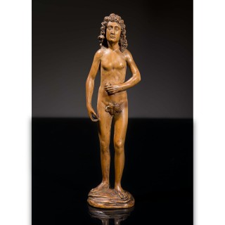 Adam en poirier sculpté en ronde-bosse. Deboutsur un tertre naturaliste, sa nudité cachée