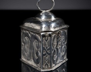 Boîte aux saintes huiles de forme triangulaireaux angles abattus en argent à décor gravé de
