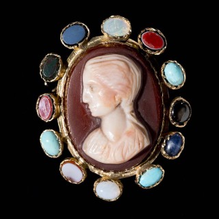 Broche de forme ovale avec camée en cornalineà décor d'un profi gauche féminin à l'antique