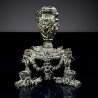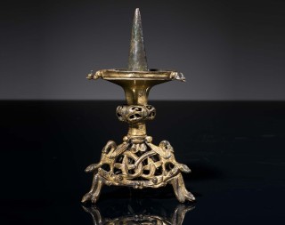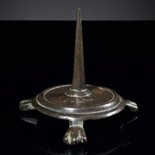Rare et grand pique-cierge à base circulairefortement moulurée reposant sur trois piedsgriffs.