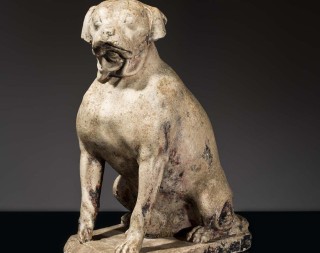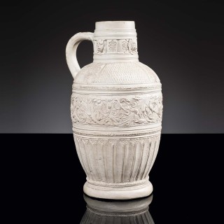 Cruche en grès blanc munie d'une anse à décor appliqué, estamp ...