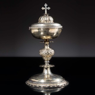 Ciboire en argent repoussé, ciselé et doré. Coupebasse reposant sur un pied avec nœud piriforme
