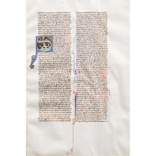 Feuillet de Bible de poche enluminée sur vélinavec texte sur deux colonnes.