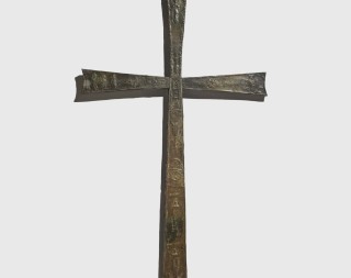 Grande croix de procession en cuivre repousséet gravé avec âme en bois. Croix latine double