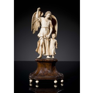 Groupe en ivoire sculpté en ronde-bossereprésentant l’Ange gardien avec un enfant.