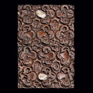 Paire de plaquettes en buis sculpté enprofondeur contrecollé sur résineux. Décor