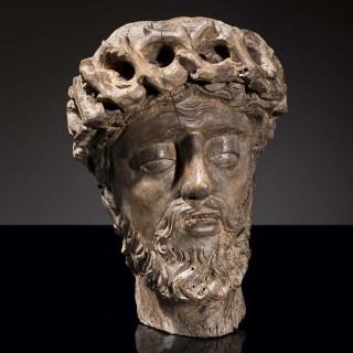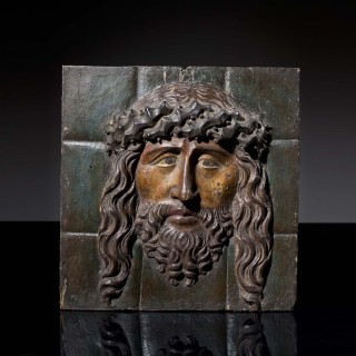 Tête de saint en bois sculpté, polychromé, évidée avec ouvertu ...