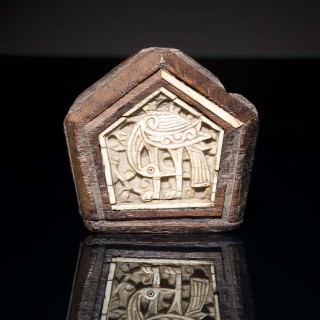 Pentagone d'assemblage en bois et os sculptéen profondeur représentant un oiseau entouré