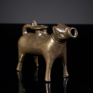 Petit aquamanile en bronze doré en forme defélin. Les pattes droites, légèrement écartées